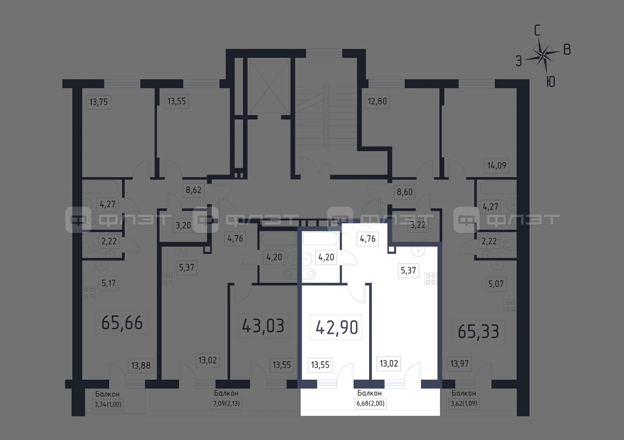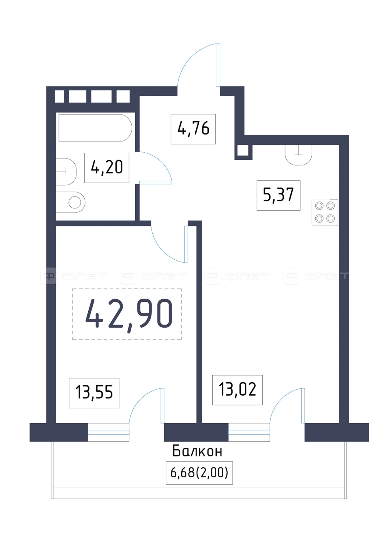 - 42.9/26.57/5.37 м²